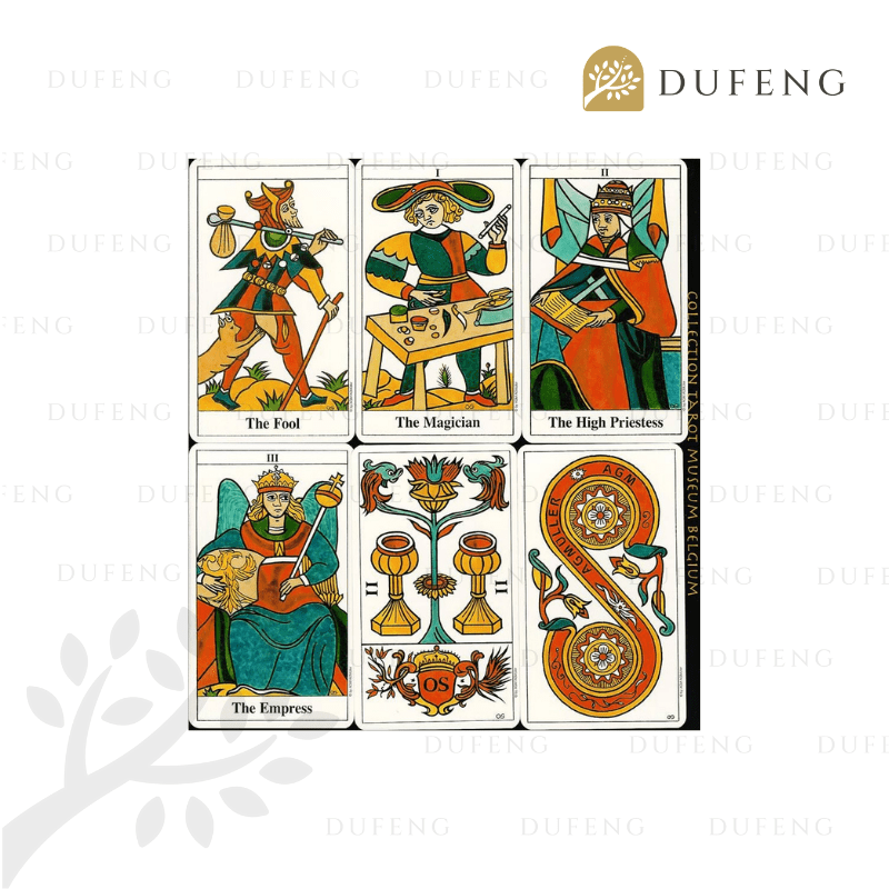 An authentic reproduction of the popular Tarot de Marseille Convos deck. The Tarot de Marseille is one of the oldest and most popular tarot deck ever created. The tarot is based on the old wood-cut presentation of the Tarot de Marseille by Nicolas Conver from the 18th Century. The artist Otto Spalinger used a completely new coloring and considered different iconographic traditions to achieve this artistically impressive deck. The bright colors brings the old templates to new, sparkling life. This edition of the Tarot de Marseille Convos is a must for all lovers of tarot!